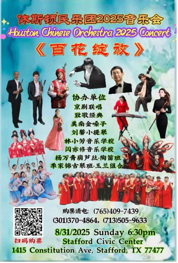 休斯顿民乐团将于8月31日举行盛大的2025年“百花绽放”音乐会,这次将携手休斯顿八家艺术团体共襄盛举。音乐会将集中展示大休斯顿地区著名专业音乐家和业余艺术高手的精彩表演,包括中西器乐大、中、小型合奏、独奏、声乐、舞蹈、戏曲等多种艺术表现形式。久负盛名的指挥家萧楫老师专为音乐会构思和创作了一首大型中西乐合奏原创乐曲,涵括二十多种乐器和有五十多位乐手参演。萧老师也改编配器了中、西乐曲,由西乐手们展现出来。这是一场中华文化艺术和参渗着西方音乐艺术的饕餮盛宴!机会不可错过!🌺
