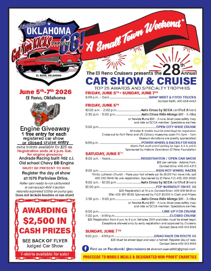 Vehicles must be 2001 or older and be street legal. Exceptions only allowed by early registration and approved by the El Reno Cruisers. Cruise starts at 7:00 pm and ends at 9:00 pm. For further information, reach out or view the event flyer.
