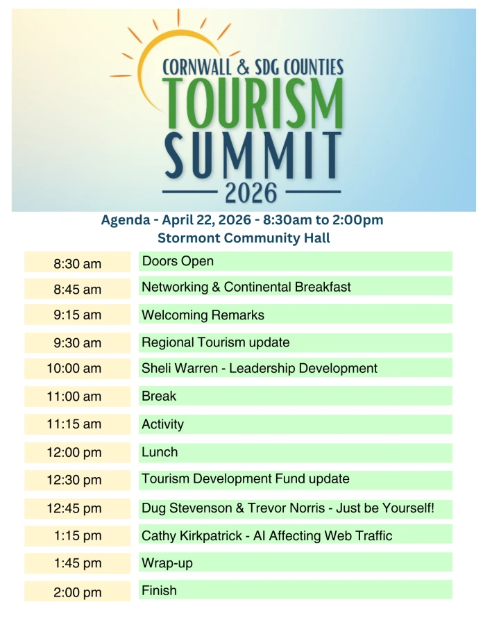 Tourism stakeholders, businesses, community organizations, and event planners are invited to attend the 2026 Cornwall & SDG Counties Tourism Summit on April 22, 2026, at Stormont Community Hall.