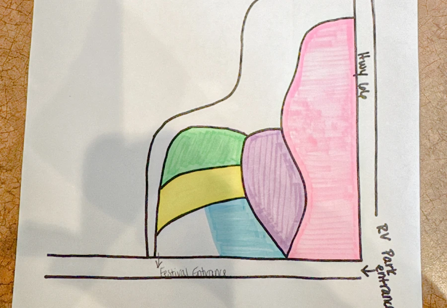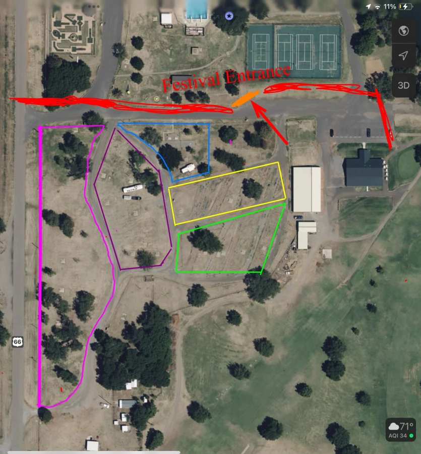 This gets you two General Admission Tickets into the festival and a pull thru RV spot closest to the festival. (Yellow)