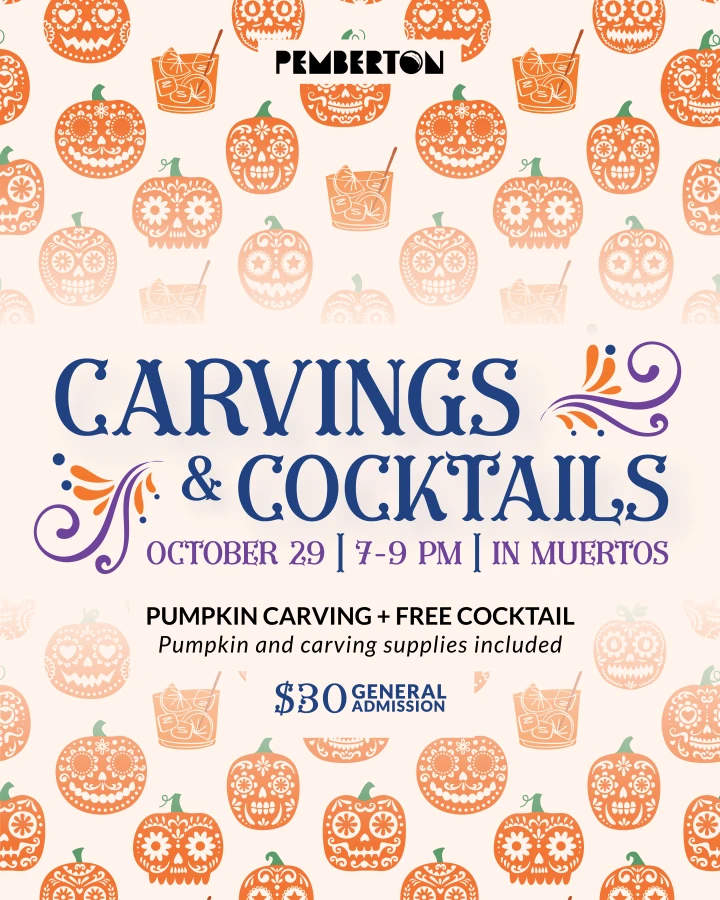 Embrace the spirit of the season with Carving & Cocktails in Muertos at The Pemberton. Gather your friends for a festive evening of creativity and craft, where each ticket includes your very own pumpkin, carving tools, and a signature cocktail or mocktail to sip while you design your masterpiece.