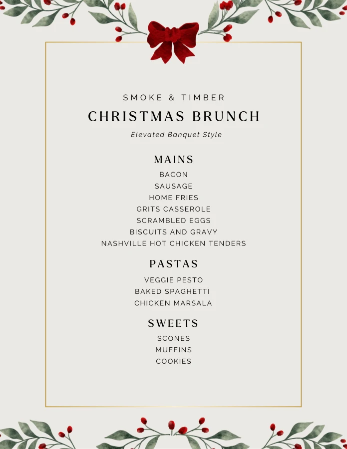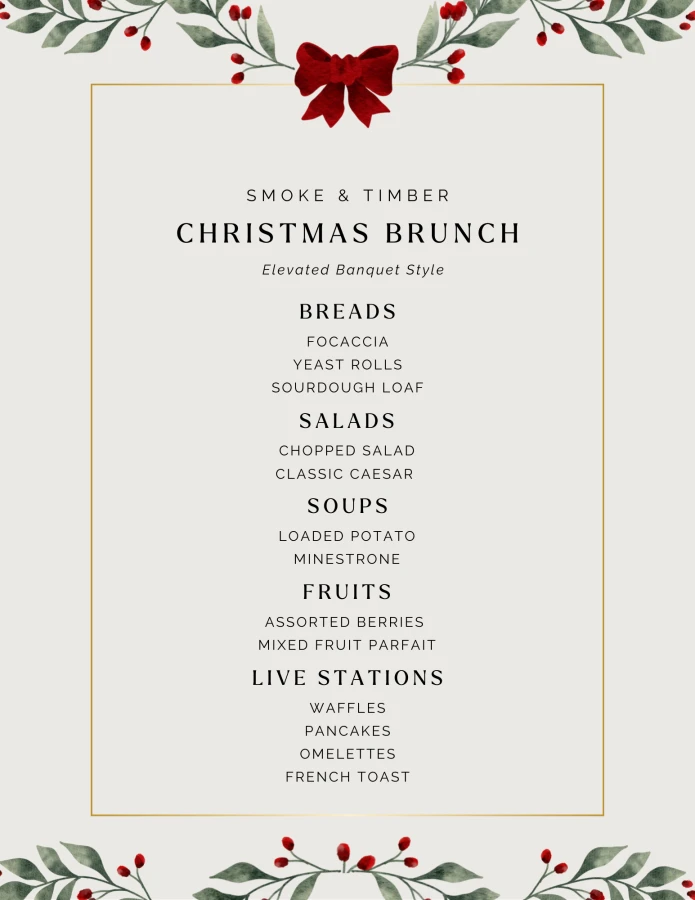 We are delighted to share that Smoke & Timber will be hosting a special Christmas Day Brunch. Whether you’re spending the holiday on the slopes or savoring a cozy day in the lodge, we invite you to join us for an elevated, festive dining experience. Our Christmas Brunch will feature a refined buffet showcasing seasonal favorites and chef-crafted holiday dishes, thoughtfully prepared for you and your family. Brunch will be served from 11:00 AM to 4:00 PM and is available by reservation only. We look forward to celebrating the season with you and creating a memorable holiday gathering.