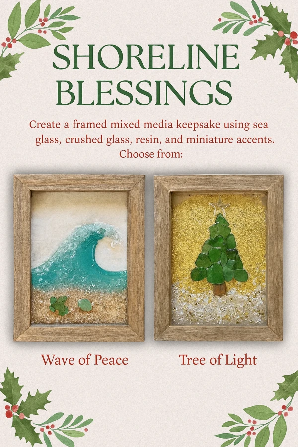 Celebrate the season with a faith-filled coastal twist! In this guided workshop, you’ll create a 5x7 framed keepsake using sea glass, crushed stained glass, resin, and miniature embellishments—all set inside a weathered wood frame with a crystal-clear acrylic base, pre-sealed for a smooth, resin-ready finish.