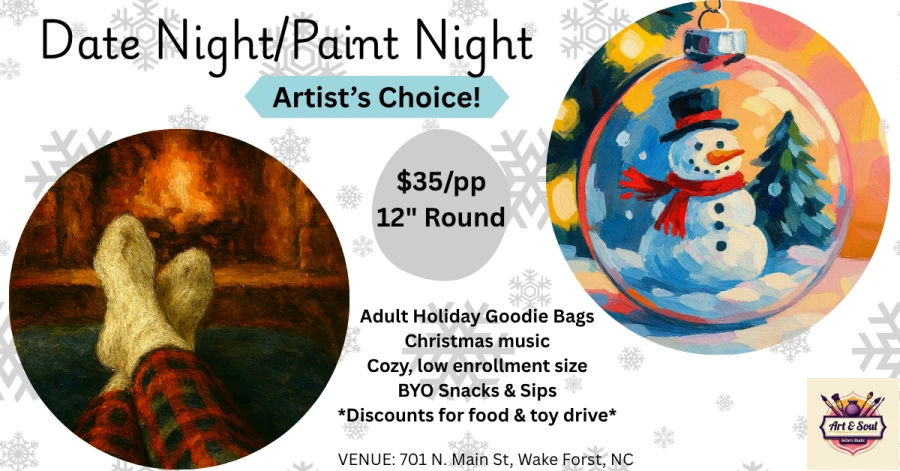 #wakeforest #downtownwf #raleigh #rolesville #youngsville #franklinton #apex #cary #wilson #kenly #wendell #zebulon #louisburg #bunn #knightdale #thingstodo #datenight #paintnight #art #artclass #paintparty #firepace #snowman #snowglobe