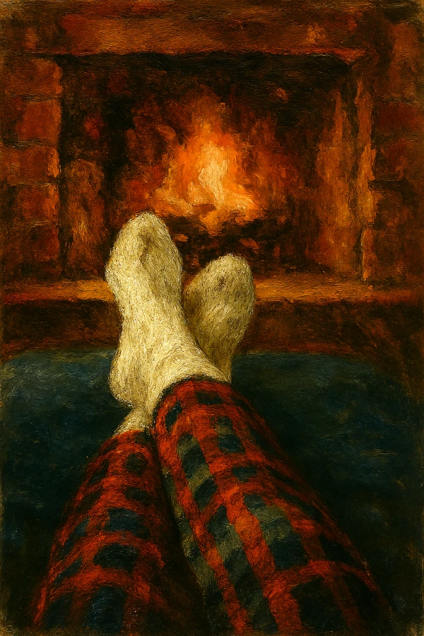 🧦 “Fireside Glow” – cozy socks, a glowing hearth, and all the warm winter vibes