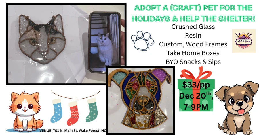First introduced to Wake Forest by Angela Von Canon, this heartfelt resin and crushed glass craft experience returns with even more purpose. Join us for a night of creativity, community, and compassion as we craft petโthemed art and support local animals in need.