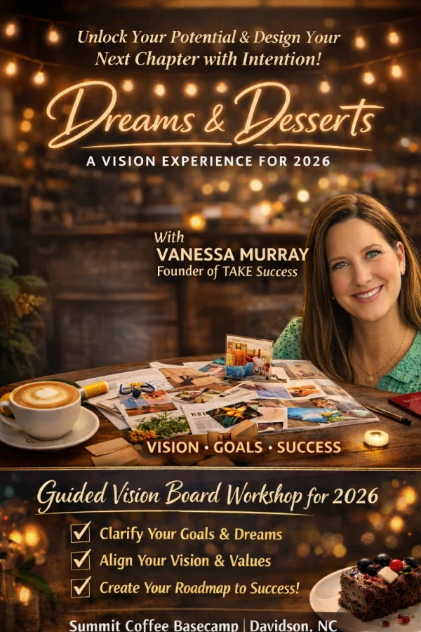 Unlock your potential and design your next chapter with intention at Dreams & Desserts, a guided vision board experience led by Vanessa Murray, founder of TAKE Success, marketing consultant and travel advisor based in Lake Norman, NC. This is not an arts-and-crafts night—it’s a strategic, heart-centered working session for entrepreneurs, visionaries, and doers who are ready to make 2026 their boldest, most intentional year yet.