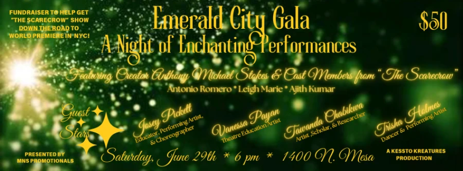 Welcome to the Emerald City Gala ~ A Night of Enchanting Performances! Get ready for a evening filled with captivating acts & dazzling entertainment. Join us Saturday, June 29th at 6:00 PM at 1400 N Mesa St for an unforgettable experience. Prepare to be enchanted by talented performers & immerse yourself in a world of wonder, thought provoking performances. At the same time, you'll be part of an awesome huge project! By supporting this gala, you'll be assisting a show created, written, directed, & starred in by a local artist born & raised in El Paso, TX fundraise to get "The Scarecrow" down the road to where it will have its World Premiere in New York City! Yes, New York City!