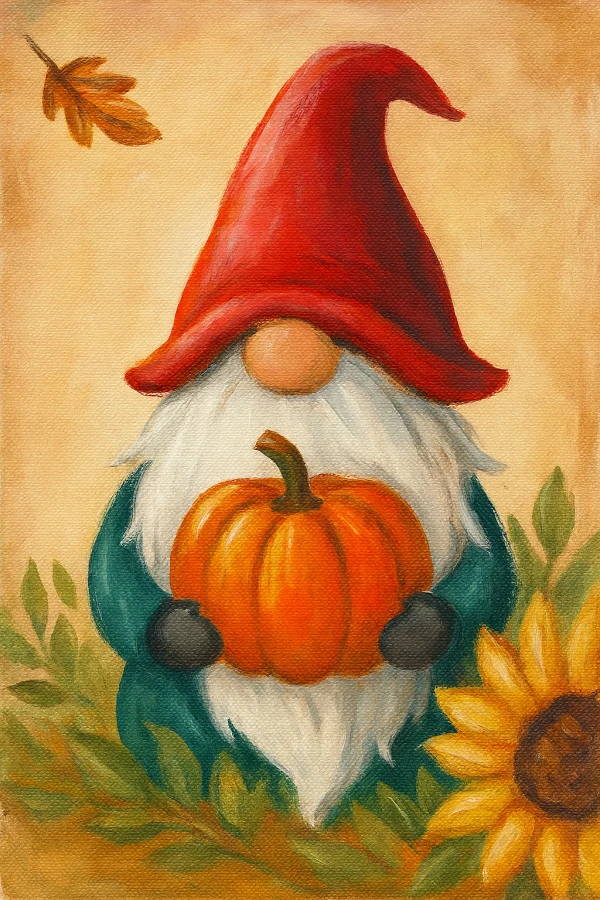Settle in for a joyful evening of guided painting as you bring whimsical harvest gnomes to life—each guest receives a large 16x20 canvas to paint beside their partner or friend. One canvas features a male gnome, the other a female gnome, both dressed in plaid hats, pumpkins, fall foliage, and warm rustic tones.