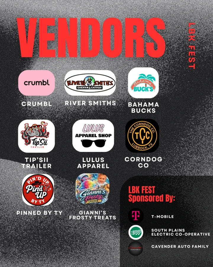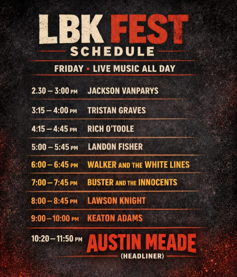 Join us for a full day of live music, food, drinks, and community at the LBK Fest. (See pictures below for schedule and vendor list)