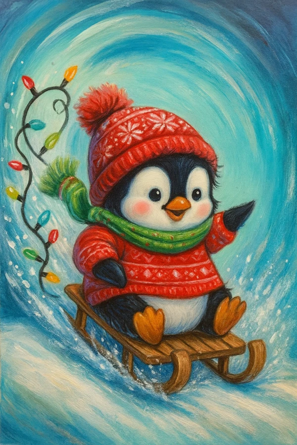š§ Penguinās Polar Plunge ā joyful sledding penguin with twinkling lights, swirling snow, and cozy knitwear