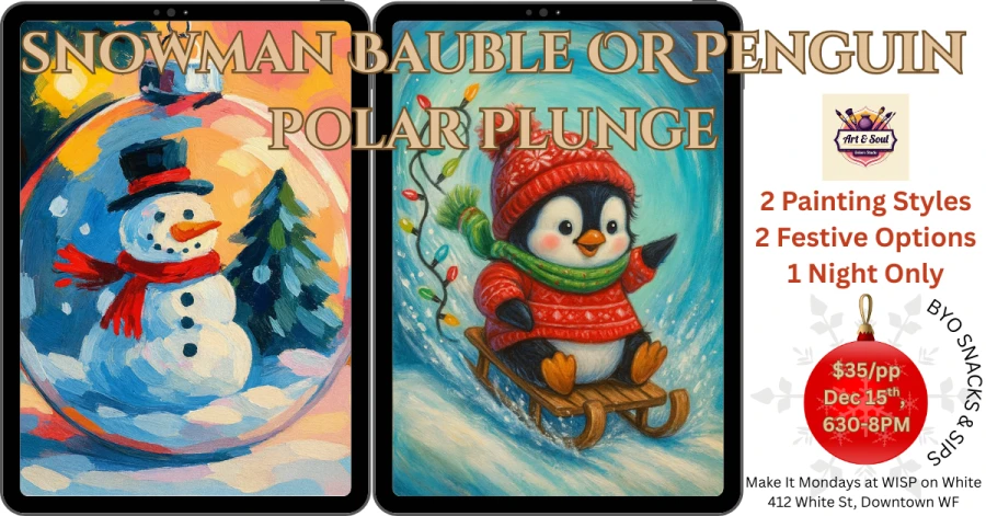 Unwind with a boutique sip-and-paint experience featuring two whimsical winter scenes ā each pre-sketched on a larger, stretched cotton canvas for a polished, painterly finish.