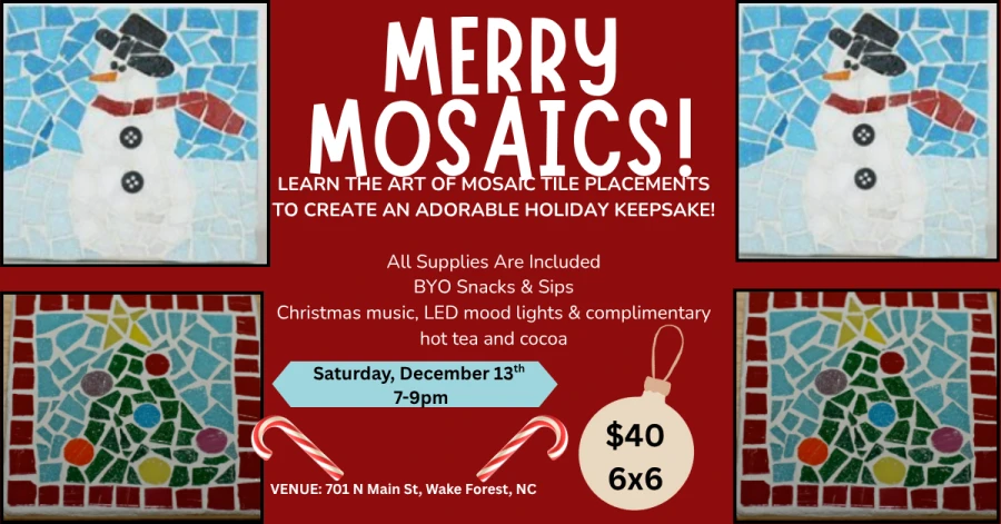 #mosaic #mosaicart #artclass #crafts #thingstodo #familyfun #christmastree #snowman #wakeforest #raleigh #rolesville #knightdale #wendell #zebulon #bunn #louisburg #youngsville #franklintonÂ