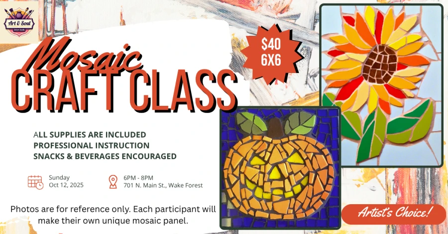 #mosaic #mosaicart #artclass #crafts #thingstodo #familyfun #pumpkin #sunflower #wakeforest #raleigh #rolesville #knightdale #wendell #zebulon #bunn #louisburg #youngsville #franklinton