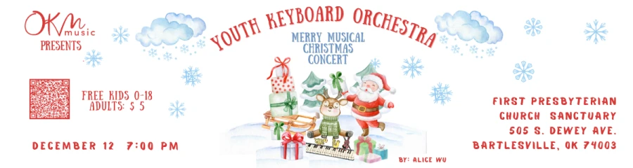 Celebrate the magic of the season with the talented young musicians of OKM’s Youth Keyboard Orchestra. Enjoy festive favorites, inspiring holiday classics, and heartwarming performances that showcase the joy and spirit of Christmas. A wonderful evening for families and music lovers alike!