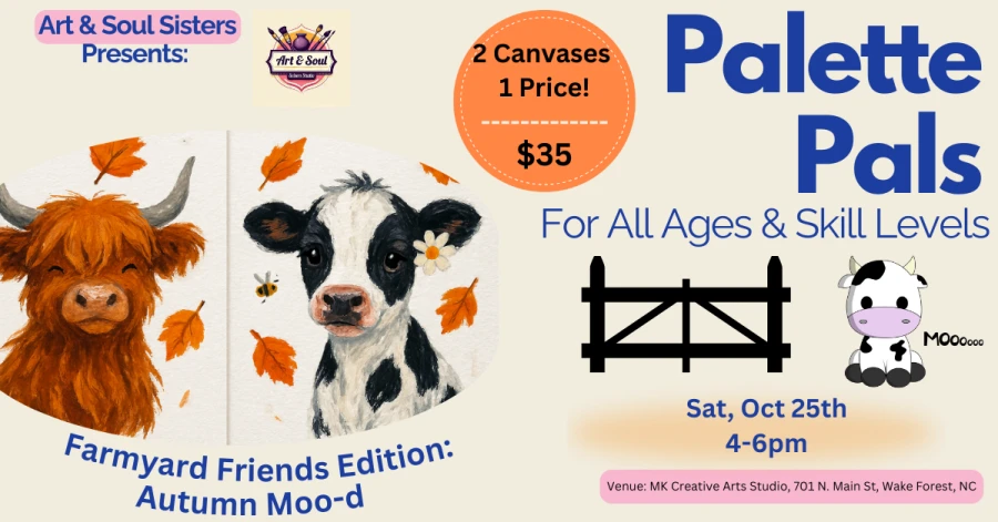 Whether you're 6 or 96, this whimsical workshop is designed to bring generations together through paint, laughter, and seasonal joy. Each pair will create two charming canvasesโone adult cow, one baby cowโconnected by autumn magic and your imagination.