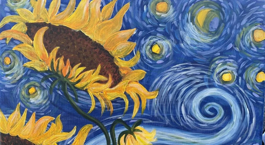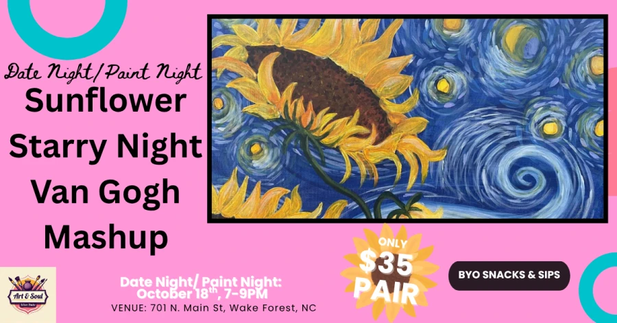 ✨ You don’t have to be an artist—just bring someone you love and a sense of adventure! This beginner-friendly class is designed to make you feel confident, creative, and connected. Whether you’re painting with your partner, best friend, or favorite neighbor, you’ll each create your own 16x20 masterpiece inspired by Van Gogh’s Starry Night and Sunflowers—with a whimsical twist!