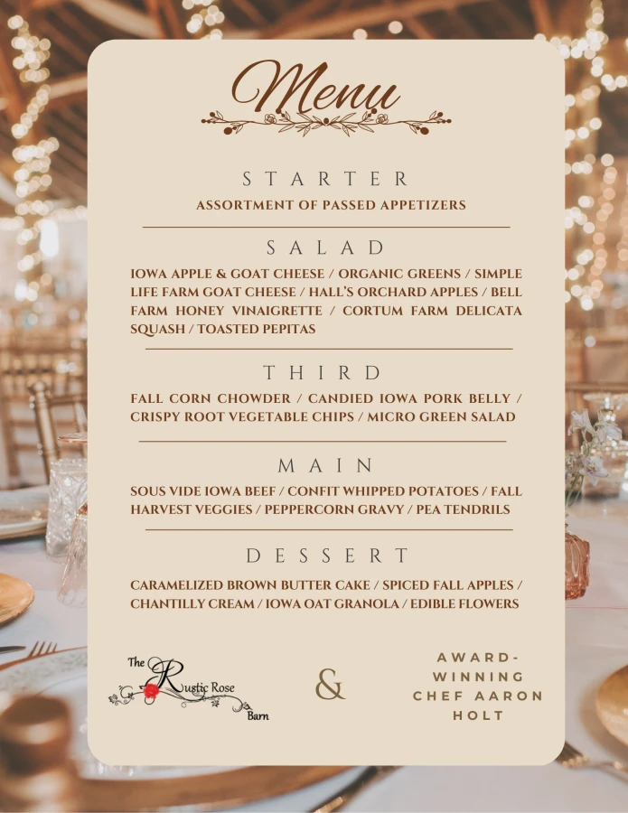 Join us for a one-night-only culinary experience on Thursday, October 9, 2025, at the beautiful Rustic Rose Barn in Roland, Iowa. This exclusive Farm to Fork dinner features a four-course plated meal prepared by award-winning Chef Aaron Holt of Doolittle Farm, alongside appetizers and one complimentary wine ticket.