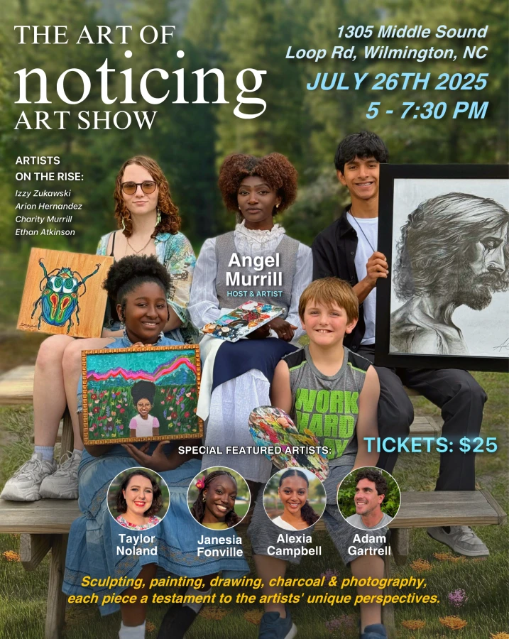 Enter a world of creativity and innovation at the Art of Noticing Art Show, Hosted by the renowned Artist Angel Murrill and the rising starts of the art world Charity Murrill, Izzy Zukowski, Arion Hernandez & Ethan Atkinson! Art show inspired by the wonderful mind and views beheld by your youth! Explore a diverse range of artistic expressions through sculpting, painting, drawing, charcoal & photography, each piece a testament to the artists' unique perspectives as they transform raw materials into works of profound beauty and meaning. Join us at the Beautiful Sycamore Bend Estate in Wilmington, NC, as we celebrate the talent and vision of these young artists.