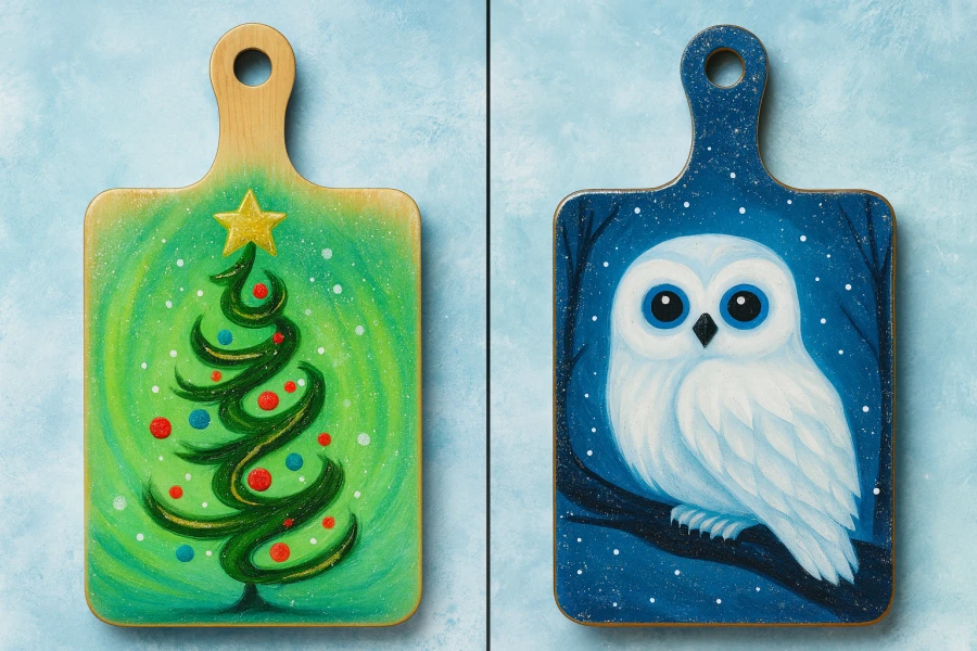 Paint · Pour · Preserve Create a winter keepsake that’s as functional as it is festive! Choose your Angela-original design—either the whimsical twisty tree or the snowy owl—and transform a real wooden charcuterie board into a glittering work of art.