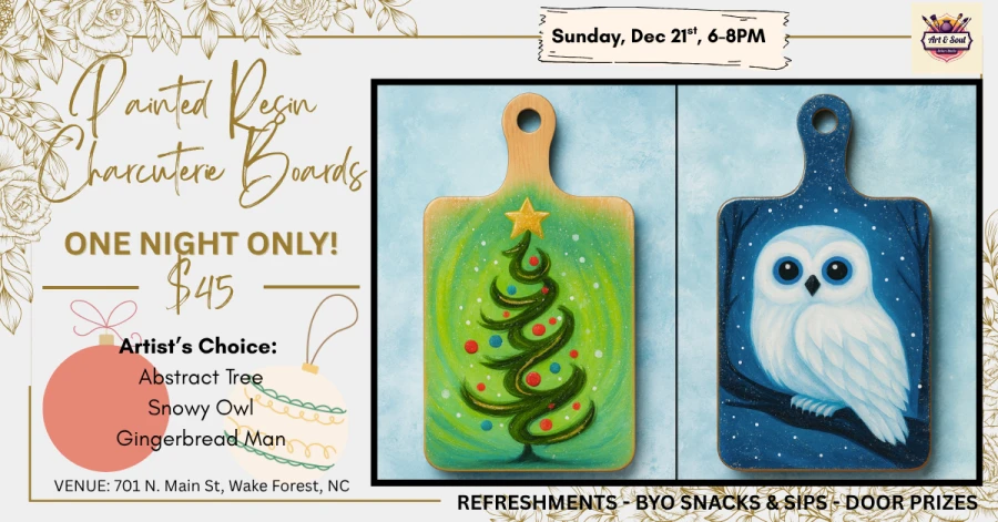 #resin #resinart #charcuterie #diy #gift #christmas #holidays #snowyowl #owl #tree #abstract #art #artclass #mixedmedia #painting #paintparty #wakeforest #downtownwf #raleigh #rolesville #youngsville #franklinton #cary #kenly #wilson #bunn #datenight #girlsnight #familyfun #knightdale #wendell #zebulon #louisburg
