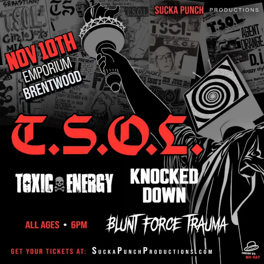 SoCal Punk Rock band T.S.O.L. comes to Brentwood Emporium with guests Toxic Energy, Knocked Down, & Blunt Force Trauma.