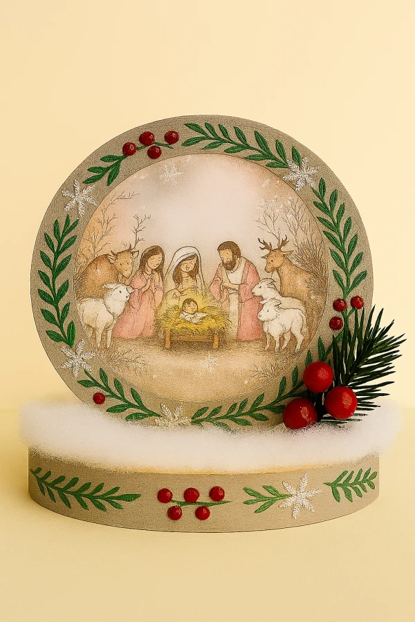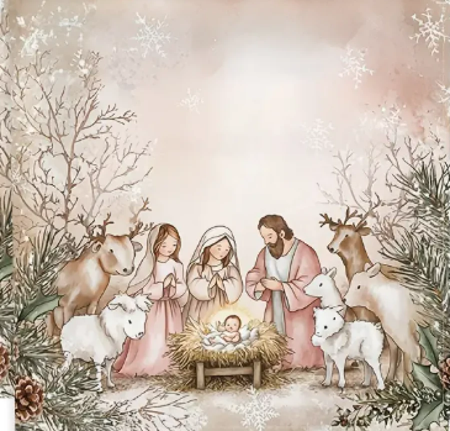 A serene depiction of the birth of Christ, surrounded by soft snow, pine accents, and optional scripture tags. A keepsake of faith, beauty, and quiet reverence.