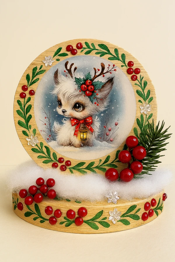 Create a circular holiday keepsake or gift that blends decoupage, mixed media, and heartfelt embellishments. Choose from two original designs: