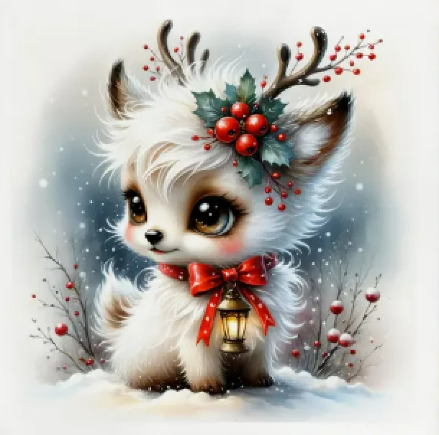 A whimsical white reindeer nestled in snowy branches, framed by berries, snowflakes, and hand-painted foliage. Perfect for gifting, decorating, or delighting little hearts.