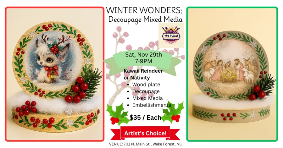 #kawaii #reindeer #decoupage #mixedmedia #nativity #artclass #crafts #wakeforest #raleigh #rolesville #youngsville #louisburg #bunn #wendell #zebulon #knightdale #franklinton #gifts #diy #keepsakes #woodworking #thingstodo #familytime #familyfun #funwithfriends