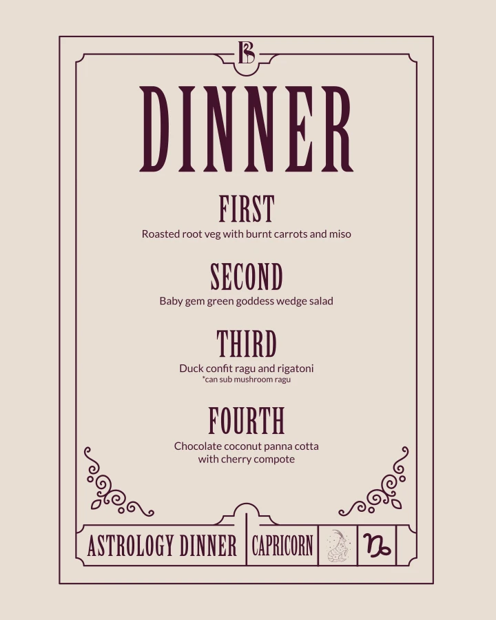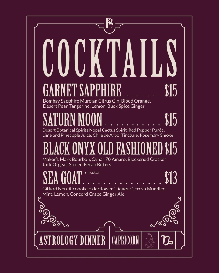 Join us for an evening of ambition, elegance, and grounded intention as we celebrate the Capricorn spirit: disciplined, determined, and timelessly refined. This dinner honors Capricorn’s appreciation for quality, tradition, and meaningful connection, set in an atmosphere of sophistication and purpose. Your ticket includes a 4-course dinner and one specialty cocktail or mocktail.