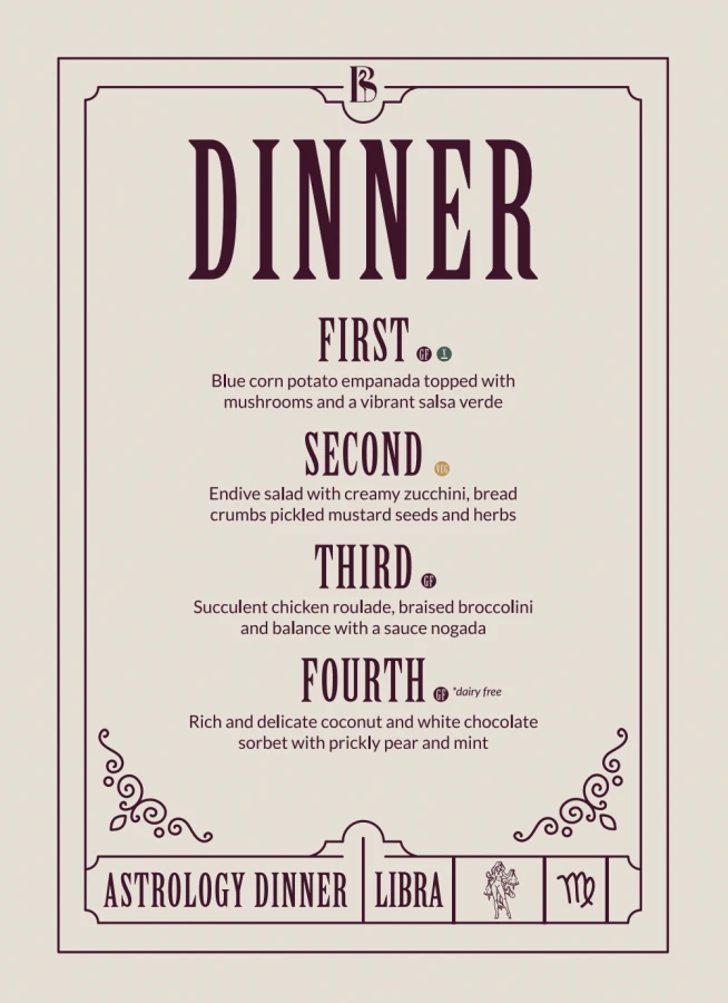 From 7:00–9:30 PM at Black Flamingo at The Pemberton, join us for an evening of cosmic harmony, curated cuisine, and star-aligned celebration. This dinner honors the Libra spirit: balanced, charming, and artfully attuned to beauty and connection. Your ticket includes a 4-course dinner, one specialty cocktail or mocktail, plus a la carte astrology readings and music under the stars.